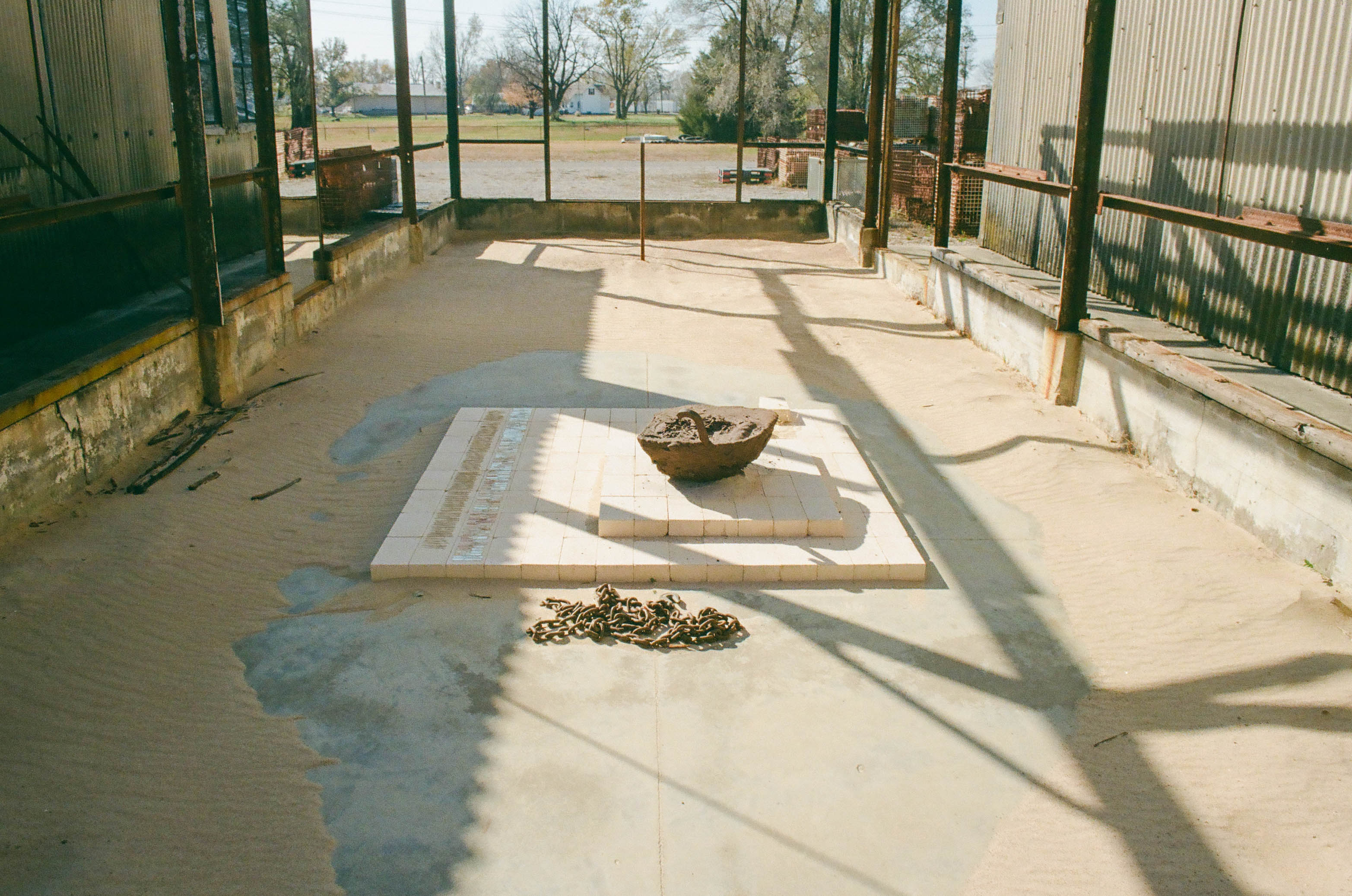 That's a really good question, and it's a complicated one to answer. The process of “reverse extraction” is an archival activity and was also intended as an initial healing gesture toward the landscape. The material detritus has a direct relationship to the former foundry and to the built environment, as both materials share a connection to land. The sand in the basin was extracted from the river; sand is also in brick and terracotta in the collection, and was used for casting. Iron was essential for casting large machine parts, but it is also present in the architectural columns. The pond retains stormwater, which filters through the sandy basin to groundwater, which travels over and under the built environment.