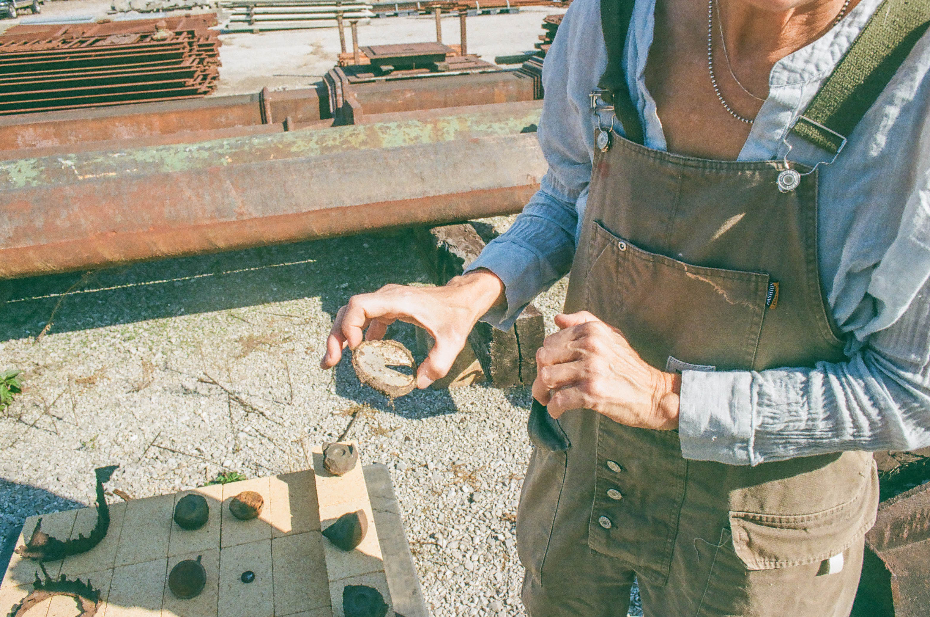 I discovered the pond while foraging to make a weaving for NONSTNDRD’s inaugural exhibition. In the fall, I returned to harvest sumac berries for ongoing work. My interest deepened when I returned on a sub-zero day in January 2024—the pond was empty, and the ground was frozen. Detritus littered the basin: grinding discs, chunks of rusty iron, and bronze and turquoise-colored slag.